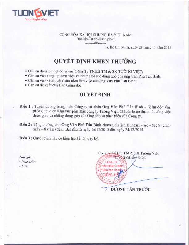 Quyết định khen thưởng nhằm công nhận những đóng góp đối với công ty và thúc đẩy, tạo động lực cho cán bộ công nhân viên luôn nỗ lực hết mình hoàn thành các nhiệm vụ được giao.